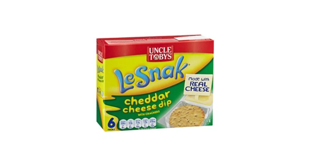 There is barely enough cheese to dip 2 of those crackers into! Uncle toby's le snak with nacho flavoured cheese is the perfect cheese dip and cracker snack, made with delicious real cheese and available in a variety of . Uncle tobys le snak cheddar cheese is the perfect cheese dip and cracker snack, made with delicious real cheese and available in a variety of flavours. Uncle tobys le snak cheddar cheese dip & crackers 6 pack. Uncle tobys le snakã‚â® is the perfect cheese dip and cracker snack, made with delicious real cheese and available in a variety of flavours.